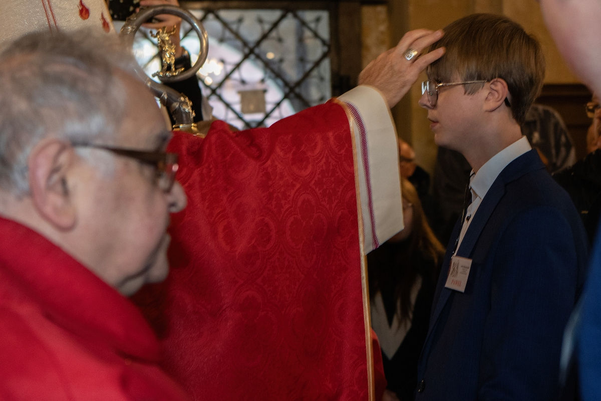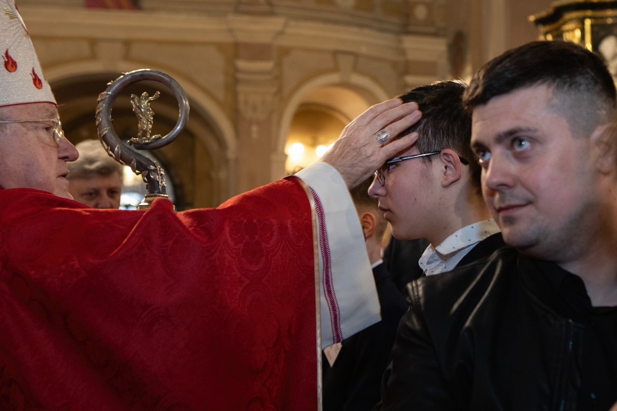Po niej nadszedł moment namaszczenia krzyżmem św. czoła każdego bierzmowanego. Na słowa: Przyjmij znamię Ducha św. każdy odpowiadał Amen. Następnie świadkowie założyli na szyję wybierzmowanych krzyże.